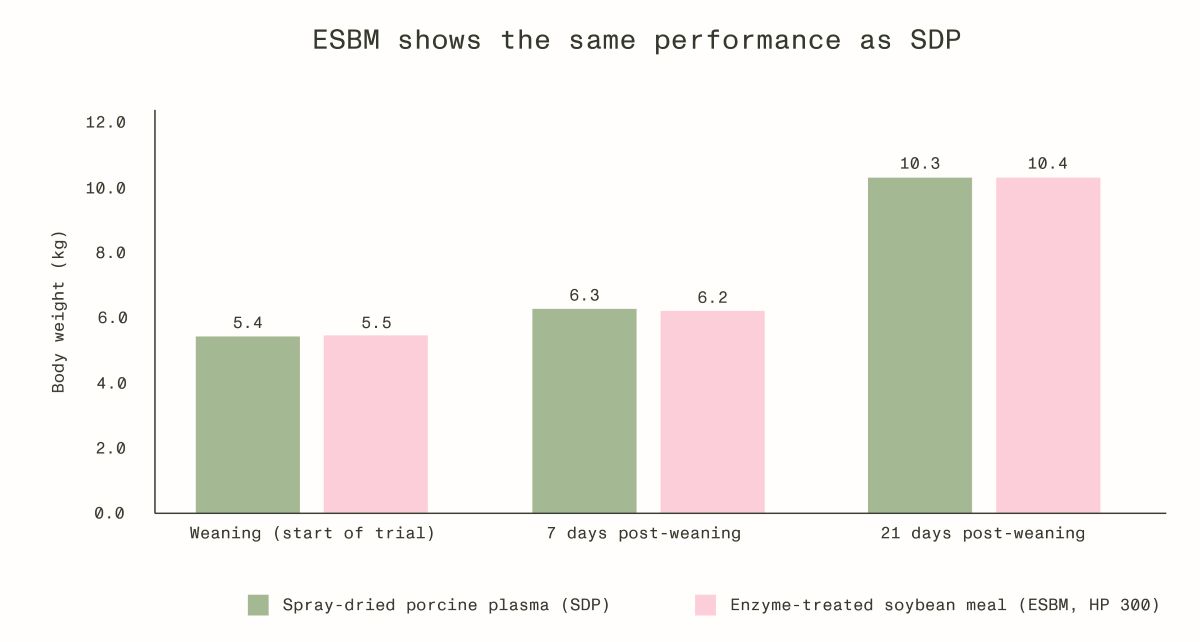 We know that the use of spray-dried blood plasma (SDP) is a well-established nutritional strategy to mitigate weaning stress, however due to different circumstances (e.g. inconsistency, regulations, price, sustainability) many operations have started to look for alternatives. From my experience, enzyme-treated soybean meal, such as HP 300 from Hamlet Protein, can effectively replace spray-dried plasma. Its low anti-nutritional factor load and high digestibility support piglet performance during weaning. Trials show comparable results between these options (Fig 1).