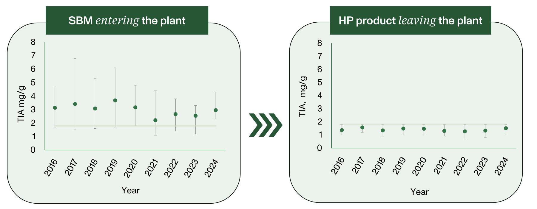 Figure 1. Trypsin inhibitors (TIA) in the raw material entering the production facility of Hamlet Protein and in the finished product. The line shown in both figures at 1.8 mg/g indicates the specified upper limit for TIA in the finished goods of Hamlet Protein. Data source: Hamlet Protein Quality Control.