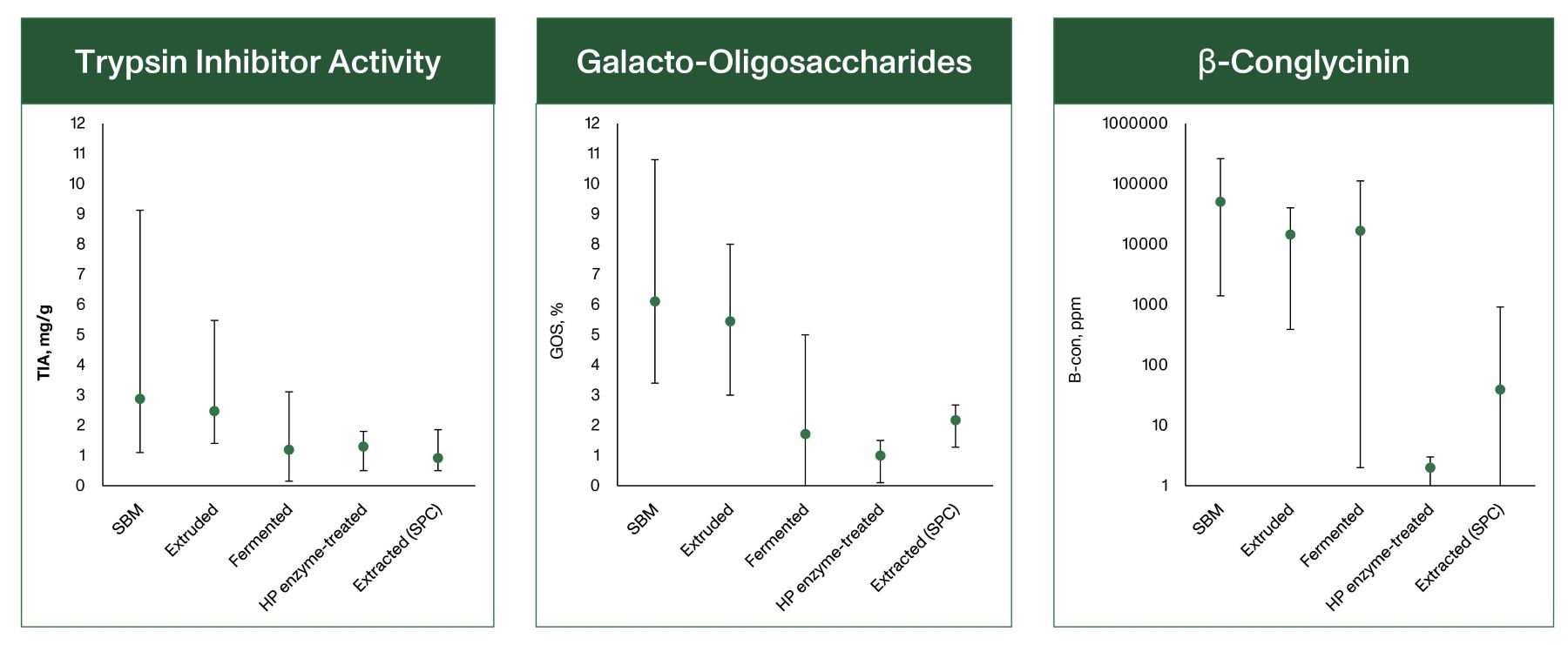 Soybean meal and soy protein products vary greatly in the content of nutrients and ANFs (Figure 2, SBM). The nutrient content and quality of soybeans vary based on factors such as soybean cultivar, growing and harvesting conditions, and processing methods in the crushing plants. This variability often forces nutritionists to tweak feed matrices.